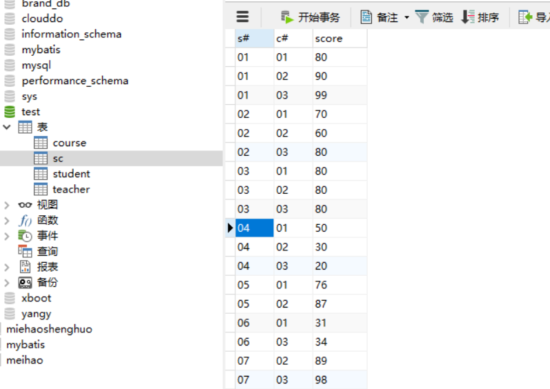 (SELECT sc.`c#`, sc.`s#`, sc.score,