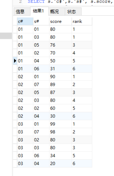 SELECT s.`c#`,s.`s#`, s.score, rank FROM