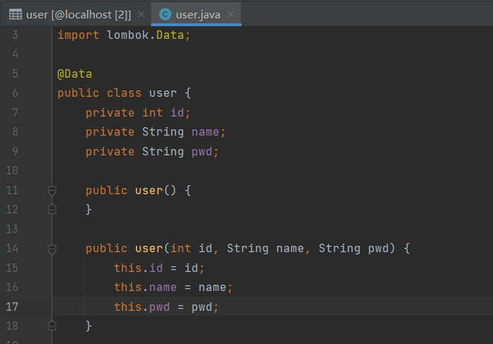 2,在数据库中创建user表,以及创建一个对应的类(该类需要属性私有,有无参构造,get/set方法,可使用@data注解),如下: