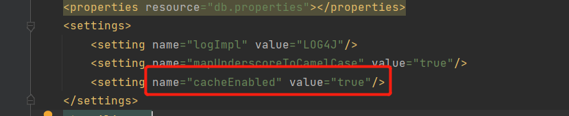 二级缓存需要手动设置,首先在核心配置文件中,有个setting属性(cacheEnabled)配置是否开启二级缓存,默认是开启的,也可以自己在显示的开启,如下图