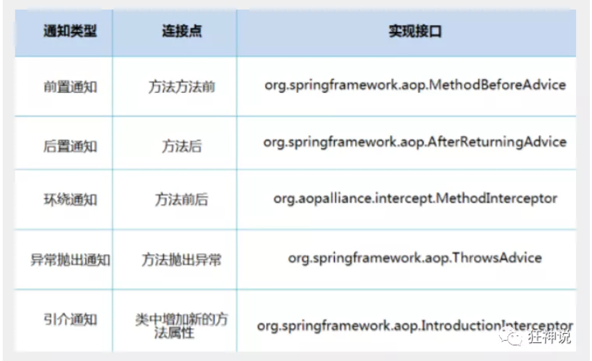 第一种,使用srping内置的接口,spring的API,进行代码插入,有五个内置接口,这里引用狂神的图: