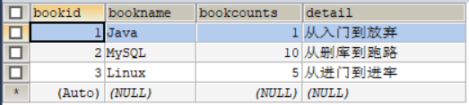 INSERT INTO books(`bookname`,`bookcounts`,`detail`)