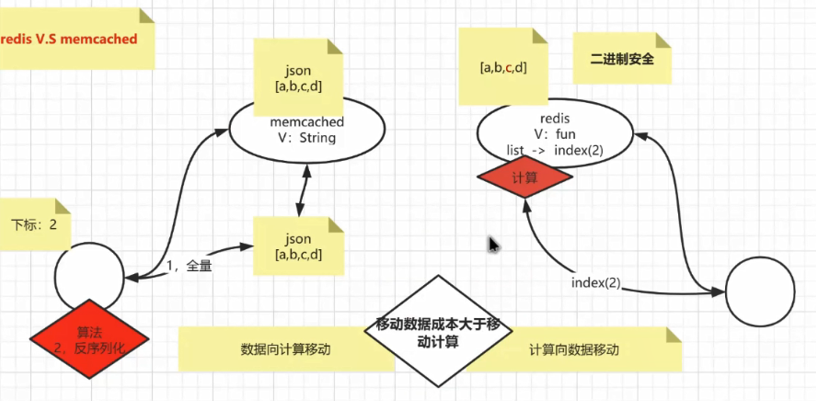 使用memcahed的时候,如果客户端发一个数据给mamcached,然后客户端要读取里面的一个数据,他需要在客户端自己准备一个算法,要把memcached那个数据全量io,取回客户端,然后再通过算法反序列化,再取到想要的数据。