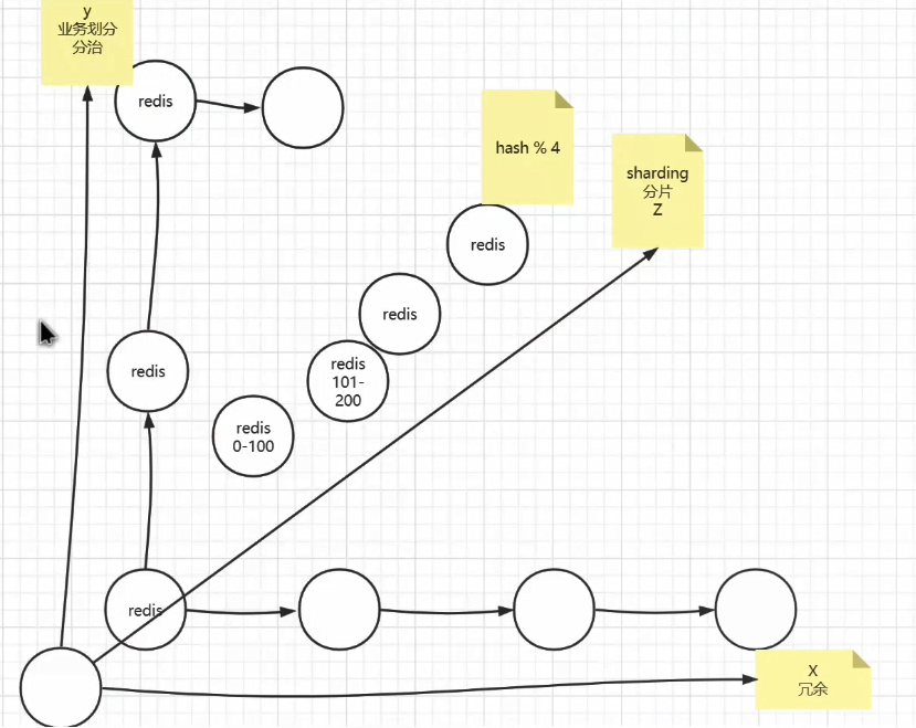 下图是一张三位表,x轴为备份的Redis服务器,虽然会造成数据冗余,但是可以保证单点故障之后数据能够恢复。y轴是业务分治,比如读操作在A服务器,写操作在B服务器,而在z轴就是业务分治之后,某台服务器的压力还是太大,需要多台服务器来分散压力。