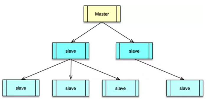 Redis 的一个 master 可以挂载多个 slave,而 slave 下还可以挂载多个 slave,形成多层嵌套结构。所有写操作都在 master 实例中进行,master 执行完毕后,将写指令分发给挂在自己下面的 slave 节点。slave 节点下如果有嵌套的 slave,会将收到的写指令进一步分发给挂在自己下面的 slave。