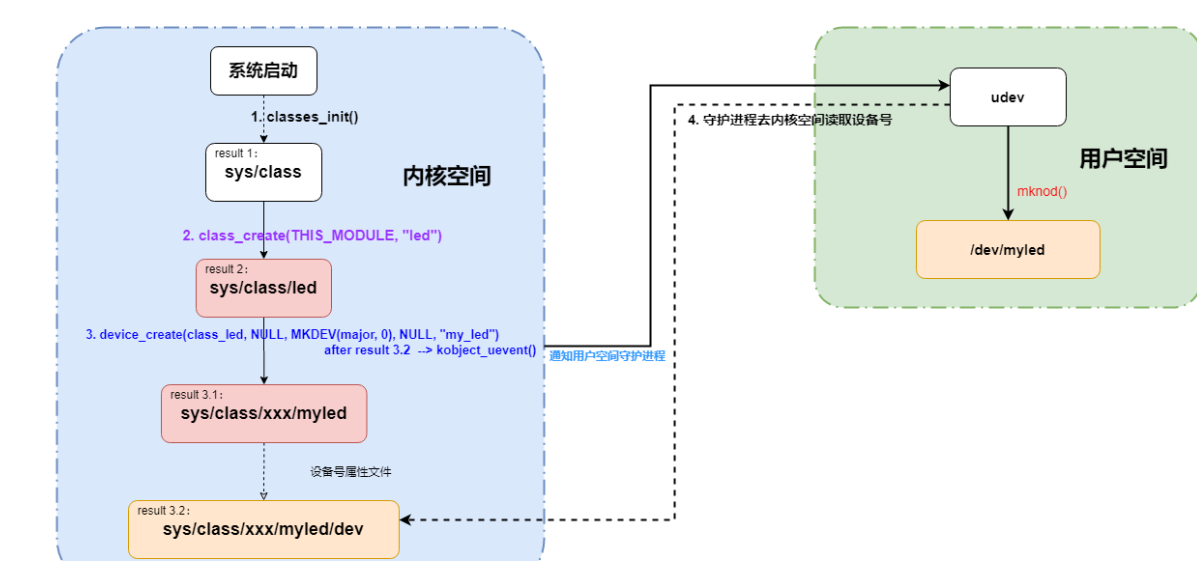- 调用device_create(),将注册的设备归于某一类下,传入设备号,这样才能找到第一步注册的设备。