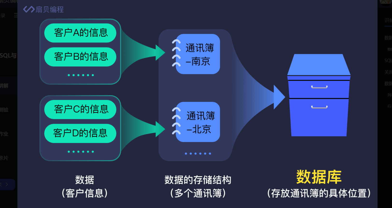 数据库 (Data Base,简写为 DB) 是用于保存数据的容器。你可以把它想象成一个虚拟的“文件柜”,其中可以放入多个“文件”,按照一定的结构保存和管理数据。