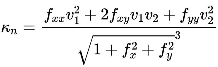 \kappa_n = \frac{f_{xx}v_1^2 + 2f_{xy}v_1v_2 + f_{yy}v_2^2 }{\sqrt{1 + f_x^2 + f_y^2}^3}