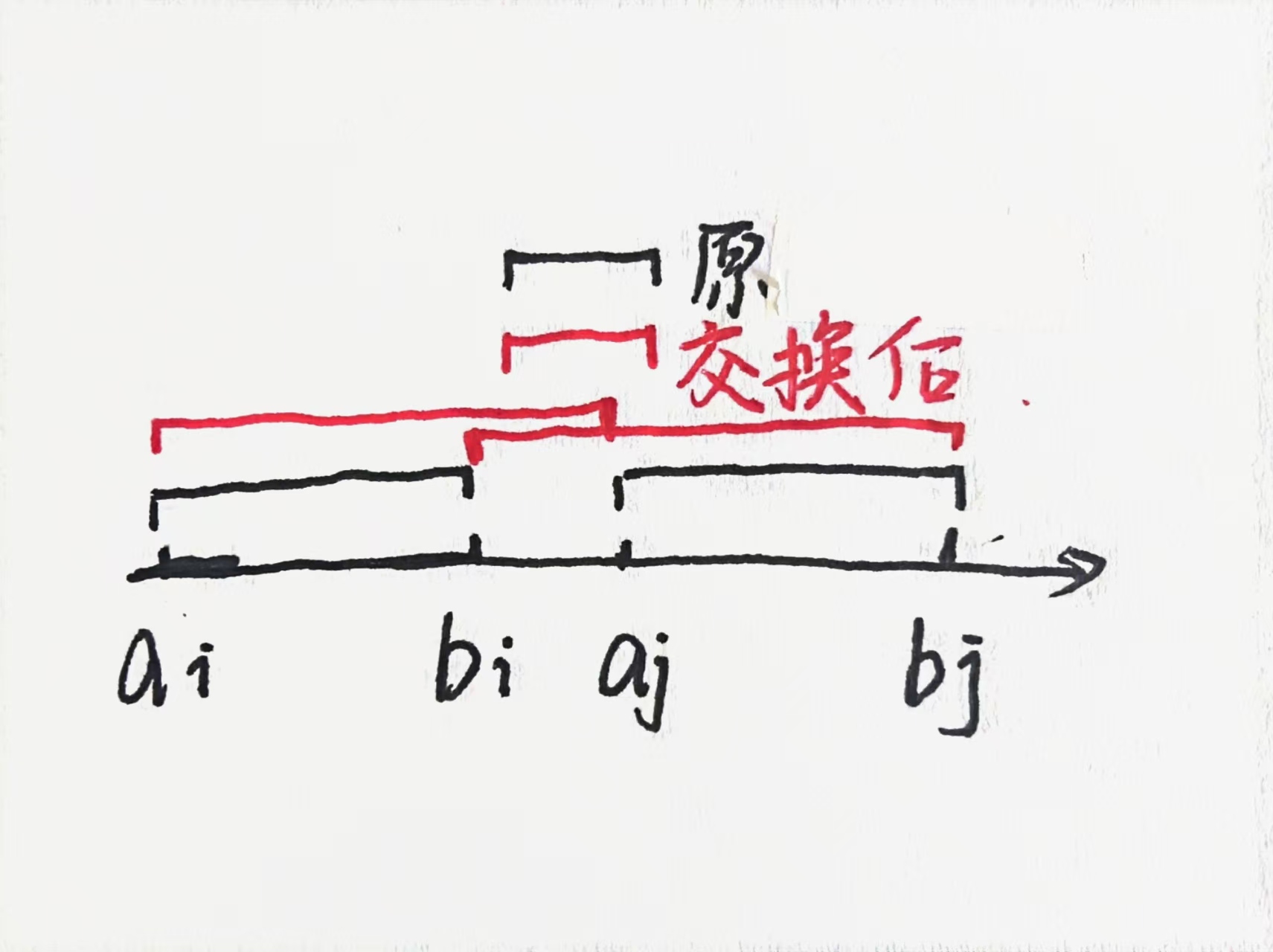 如果没有找到那样一组,那么对于任意一组满足 \(a_i \le a_j\) 的 \(i\),\(j\),有 \(b_i<a_j\)。容易发现,对于这样的一组,交换后增加的钱数为 \(2*(a_j-b_i)\)。如图: