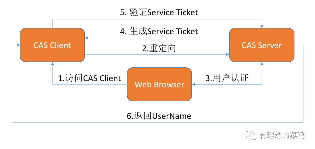 而CAS则是SSO的一种经典实现方式,其主要由三部分组成,web浏览器,CAS客户端,CAS服务器。其实并不复杂,通过下面一张图就可以了解CAS单点登录的机制:
