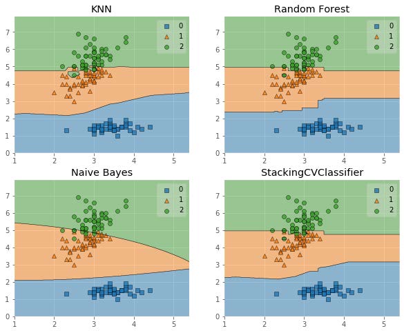 for clf, lab, grd in zip([clf1, clf2, clf3, sclf],['KNN','Random Forest','Naive Bayes','StackingCVClassifier'],itertools.product([0, 1], repeat=2)):