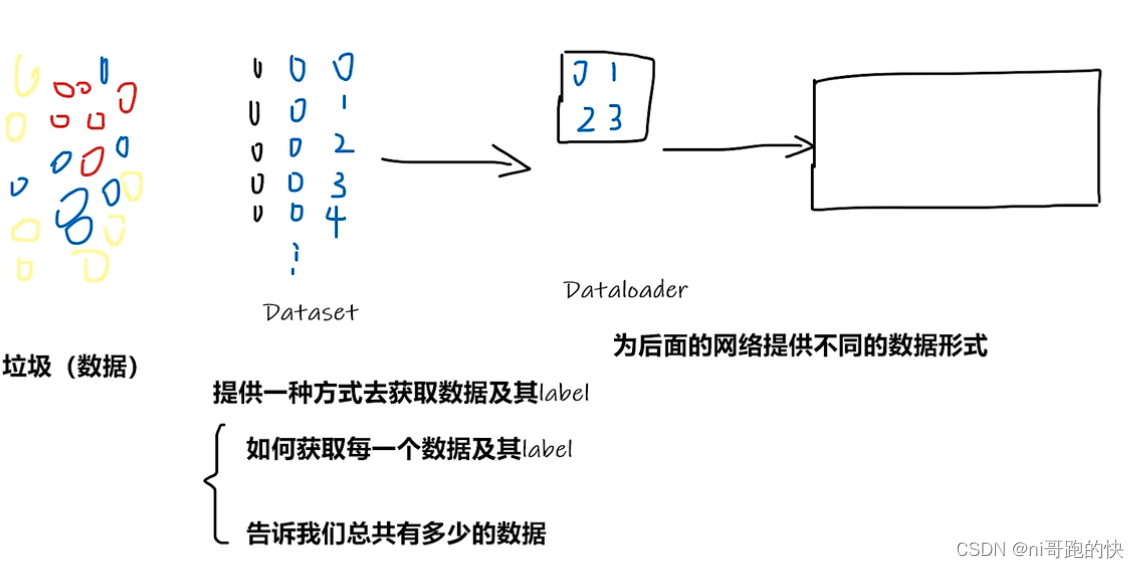 通过Dataset方法将数据进行下载,这个方法包含了两个函数,分别是getitem和111;Dataloader则是将数据进行打包,为后面的网络提供不同的数据形式