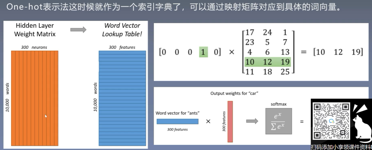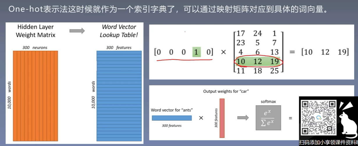 我们可以发现使用one-hot进行映射其实第四个词映射的结果就是隐藏层的第四行。所以其实映射矩阵就是one-hot的查找表