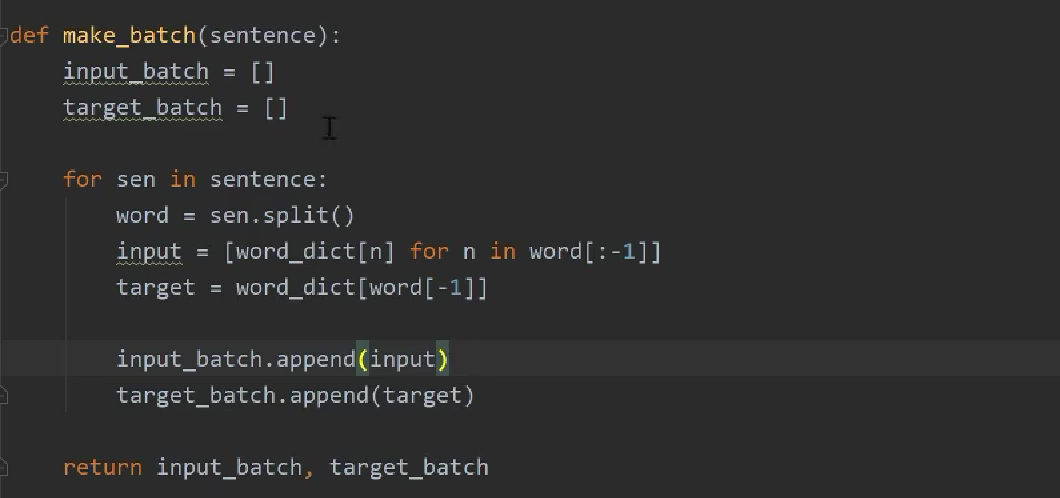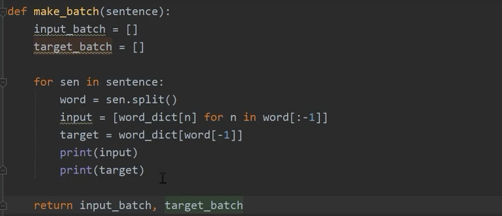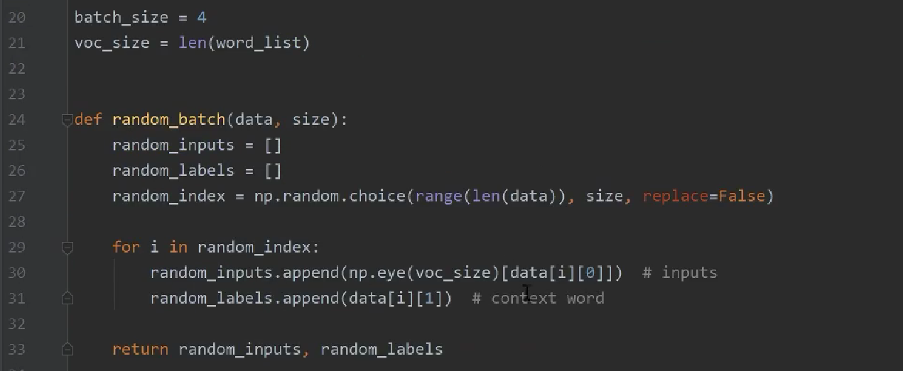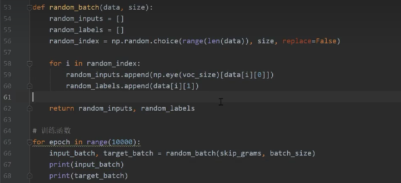 获取到下标之后,根据下标信息回到sentences找到对应的语句,输入到random_input.append,[data[i][0]]的含义是将该句话的第一个词拿出来