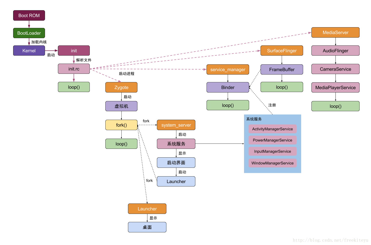 ROM里的预设代码开始执行,然后加载引导程序到RAM; - Boot Loader:这是启动Android系统之前的引导程序,主要是检查RAM,初始化硬件参数等功能。