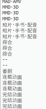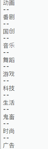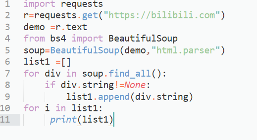 这段代码是先用requests库提取b站的所有代码,然后用bs4库使提取的标签代码变得更整齐,然后创建一个列表,用beaytifulsoup中的find_all()函数加上for循环履遍所有‘div’标签,如果标签中不为空值,则存入列表中。最后打印列表。但是输出结果却并不如人意: