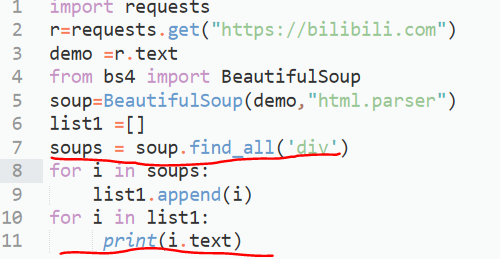 上图红线是改进后代码的不同之处。在find_all()函数中添加了标签参数,存入sopus中,再循环将标签内容送入列表,此时列表中有完整的标签,形如<div>string<div>格式,所以最后将列表内容输出时要加.text输出标签里的string。