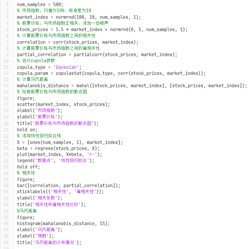 使用统计工具箱,对模拟的金融数据进行相关性和偏相关性分析,估计copula参数、计算马氏距离,用于分析股票价格与市场指数之间的关系,帮助投资者和决策者更好地理解市场动态。