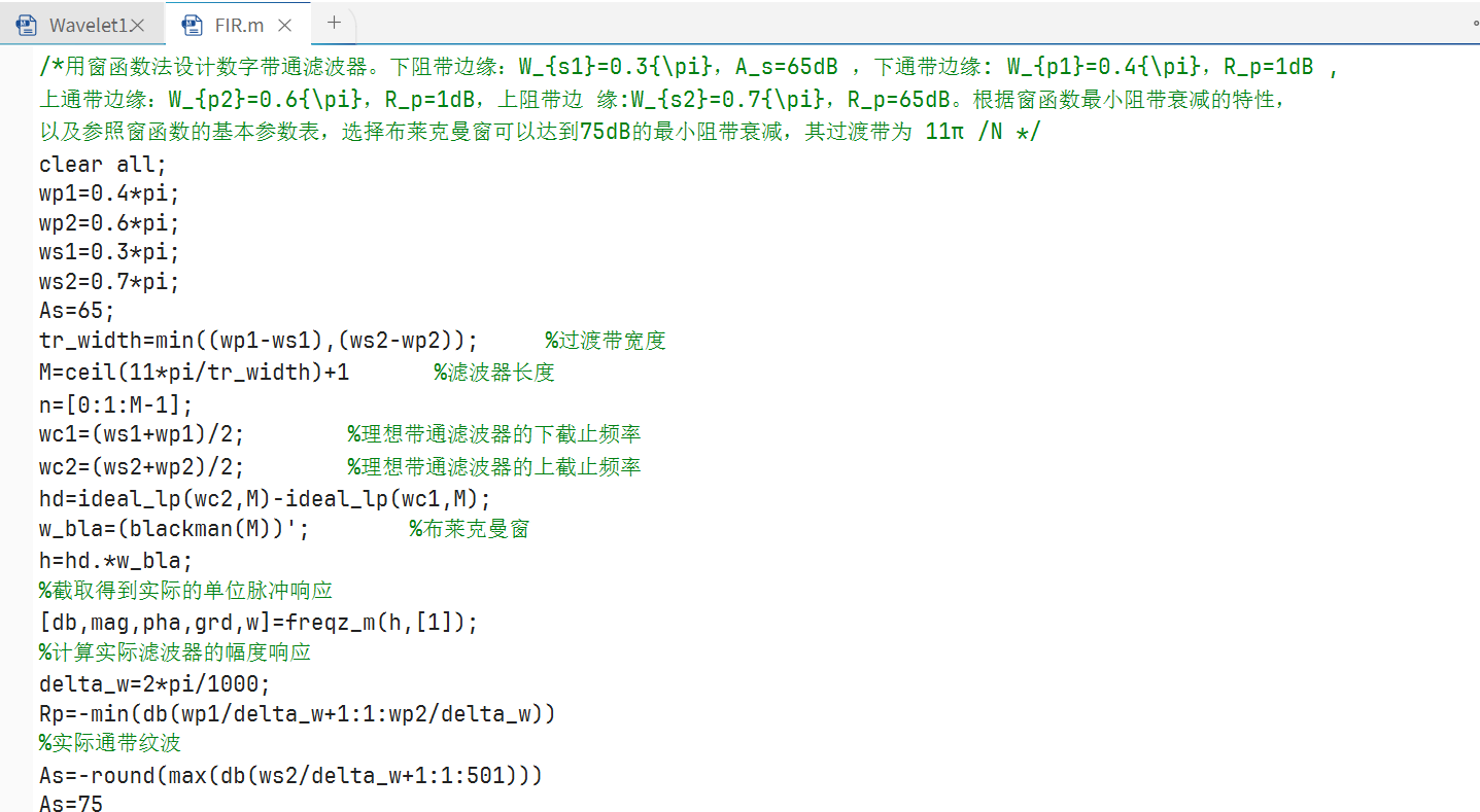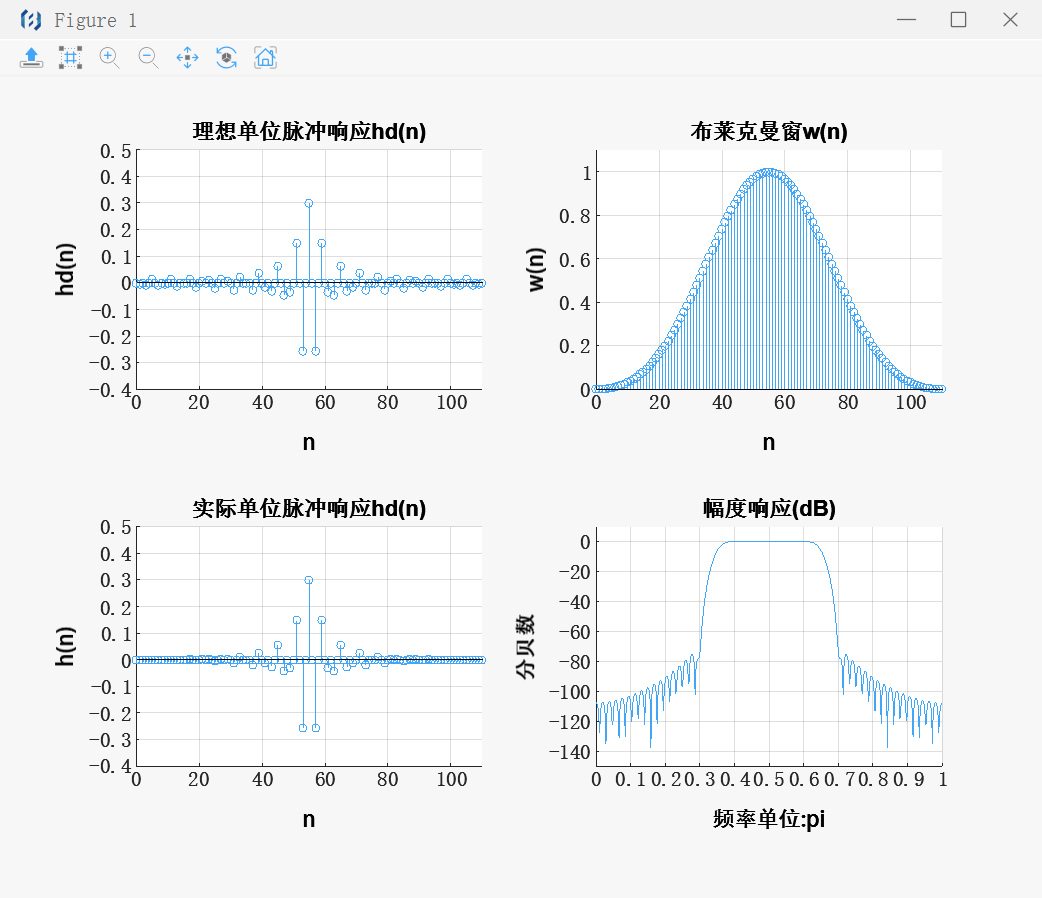 FIR滤波器在通信、图像处理、模式识别等领域都有着广泛的应用。使用北太天元的信号处理工具箱,可以采用多种方法进行FIR滤波器的设计与仿真,上面的案例使用布莱克曼窗设计了一个FIR滤波器(部分代码)。