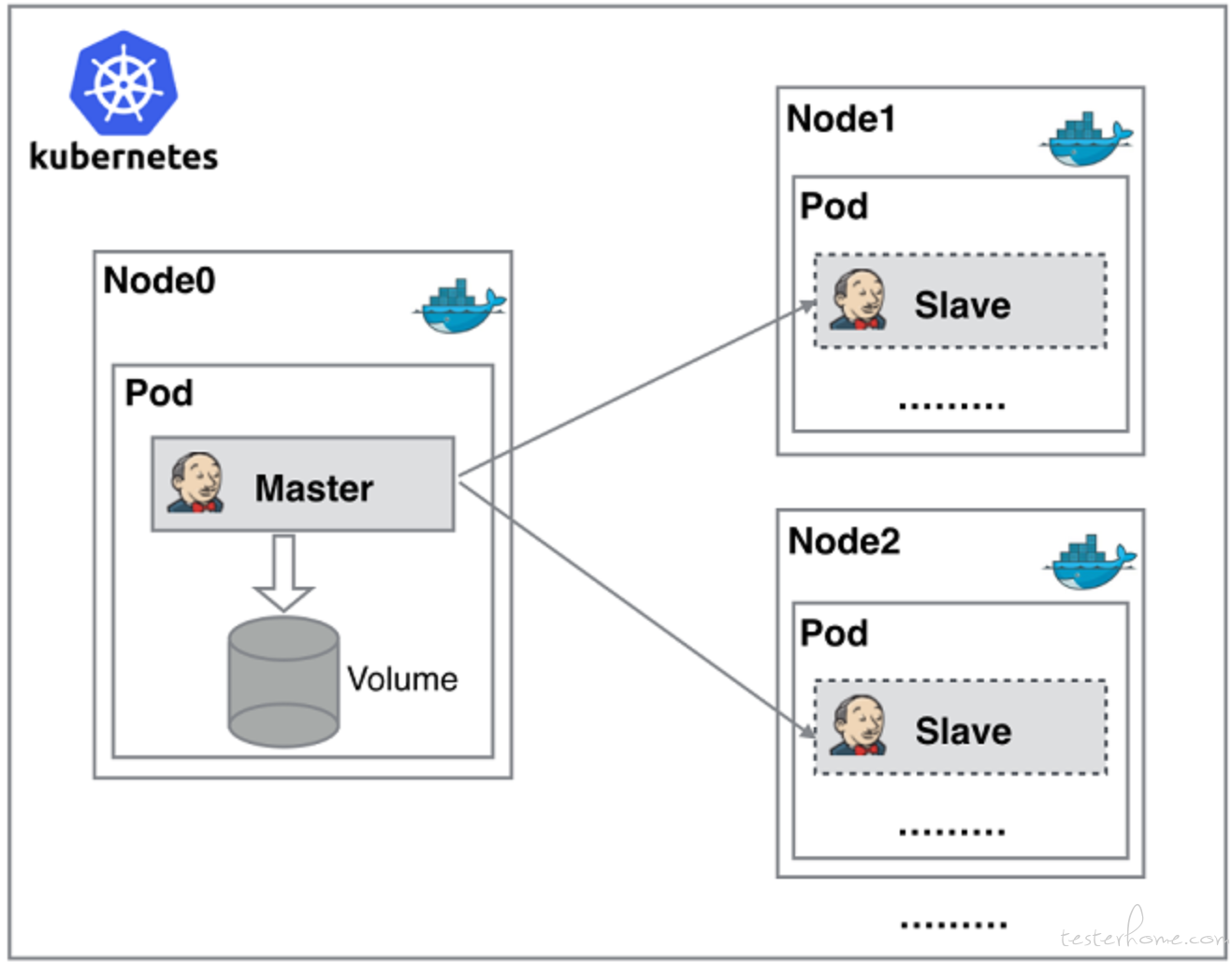 Jenkins Master 和 Jenkins Slave 以 Docker Container 形式运行在 Kubernetes 集群的 Node 上,Master 运行在其中一个节点,并且将其配置数据存储到一个 Volume 上去,Slave 运行在各个节点上,并且它不是一直处于运行状态,它会按照需求动态的创建并自动删除。