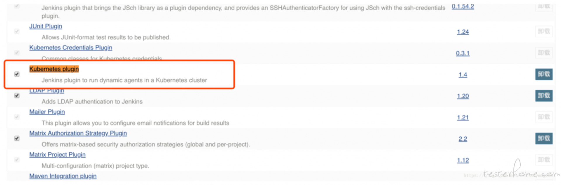 管理员账户登录 Jenkins Master 页面,点击 “系统管理” —> “管理插件” —> “可选插件” —> “Kubernetes plugin” 勾选安装即可。