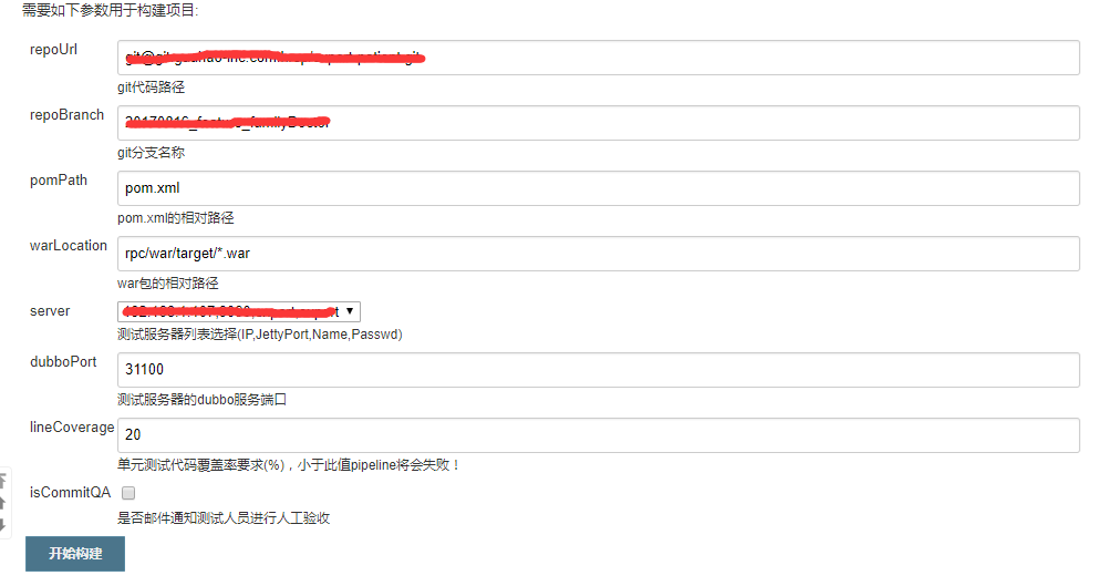 string(name:'repoUrl', defaultValue: 'git@git.*****.com:*****/*****.git', description: 'git代码路径')
