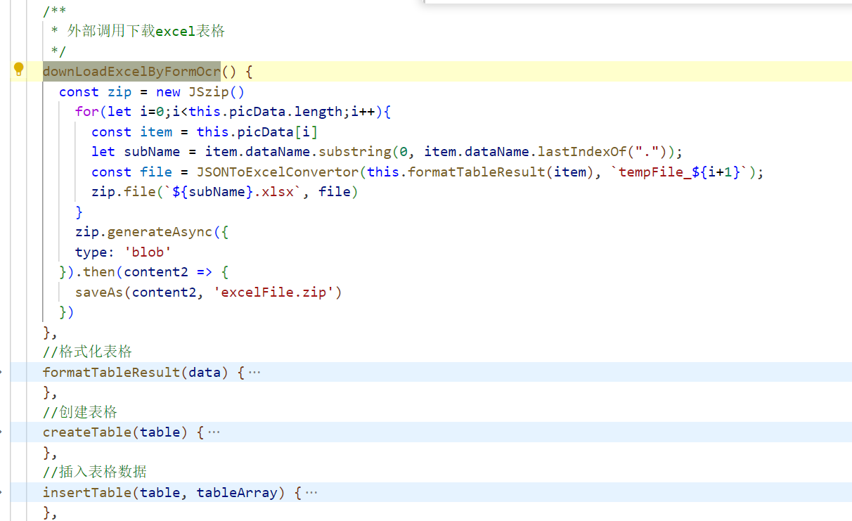 /** * 外部调用下载excel表格 */ downLoadExcelByFormOcr() { const zip = new JSzip() for(let i=0;i<this.picData.length;i++){ const item = this.picData[i] let subName = item.dataName.substring(0, item.dataName.lastIndexOf(".")); // 设置文件名 const file = JSONToExcelConvertor(this.formatTableResult(item), `tempFile_${i+1}`);