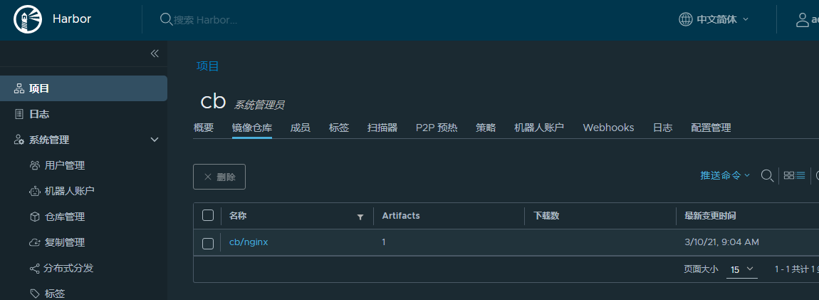 [root@cb harbor]# docker rmi 192.168.157.10/cb/nginx:v0.1 Untagged: 192.168.157.10/cb/nginx:v0.1 [root@cb harbor]# docker pull 192.168.157.10/cb/nginx:v0.1 v0.1: Pulling from cb/nginx Digest: sha256:48c5882df6bbd2786bd127d6a9249e21b8455b499c7ae05ee1adfd451a4bd988 Status: Downloaded newer image for 192.168.157.10/cb/nginx:v0.1 192.168.157.10/cb/nginx:v0.1 [root@cb harbor]# docker images REPOSITORY TAG IMAGE ID CREATED SIZE 192.168.122.143/cb/nginx latest ff5649acd9aa 3 hours ago 390MB 192.168.157.10/cb/nginx latest ff5649acd9aa 3 hours ago 390MB