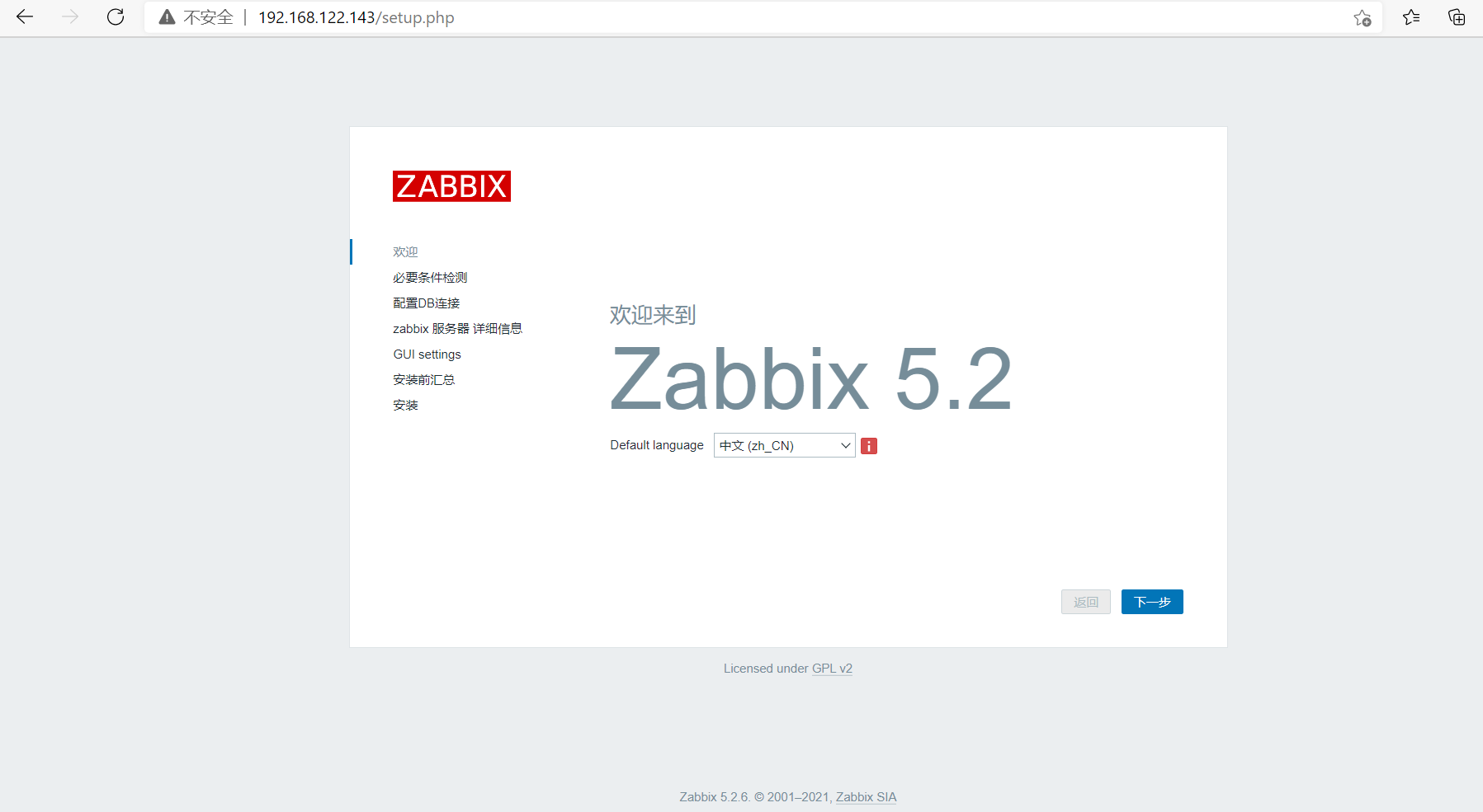 //修改/etc/php.ini的配置并重启php-fpm [root@cb zabbix-5.2.6]# sed -ri 's/(post_max_size =).*/\1 16M/g' /etc/php.ini [root@cb zabbix-5.2.6]# sed -ri 's/(max_execution_time =).*/\1 300/g' /etc/php.ini [root@cb zabbix-5.2.6]# sed -ri 's/(max_input_time =).*/\1 300/g' /etc/php.ini [root@cb zabbix-5.2.6]# sed -i '/;date.timezone/a date.timezone = Asia/Shanghai' /etc/php.ini[root@cb zabbix-5.2.6]# service php-fpm restart Redirecting to /bin/systemctl restart php-fpm.service [root@cb zabbix-5.2.6]# mkdir /usr/local/apache/htdocs/zabbix [root@cb zabbix-5.2.6]# cp -r ui/* /usr/local/apache/htdocs/zabbix/ [root@cb zabbix-5.2.6]# chown -R apache.apache /usr/local/apache/htdocs //配置apache虚拟主机 [root@cb zabbix-5.2.6]# vim /usr/local/apache/conf/extra/vhosts.conf <VirtualHost *:80> DocumentRoot "/usr/local/apache/htdocs/zabbix" ServerName www.cb.com ProxyRequests Off ProxyPassMatch ^/(.*\.php)$ fcgi://127.0.0.1:9000/usr/local/apache/htdocs/zabbix/$1 <Directory "/usr/local/apache/htdocs/zabbix"> Options none AllowOverride none Require all granted </Directory> </VirtualHost> //设置zabbix/conf目录的权限,让zabbix有权限生成配置文件zabbix.conf.php [root@cb zabbix-5.2.6]# chmod 777 /usr/local/apache/htdocs/zabbix/conf [root@cb zabbix-5.2.6]# apachectl restart httpd not running, trying to start