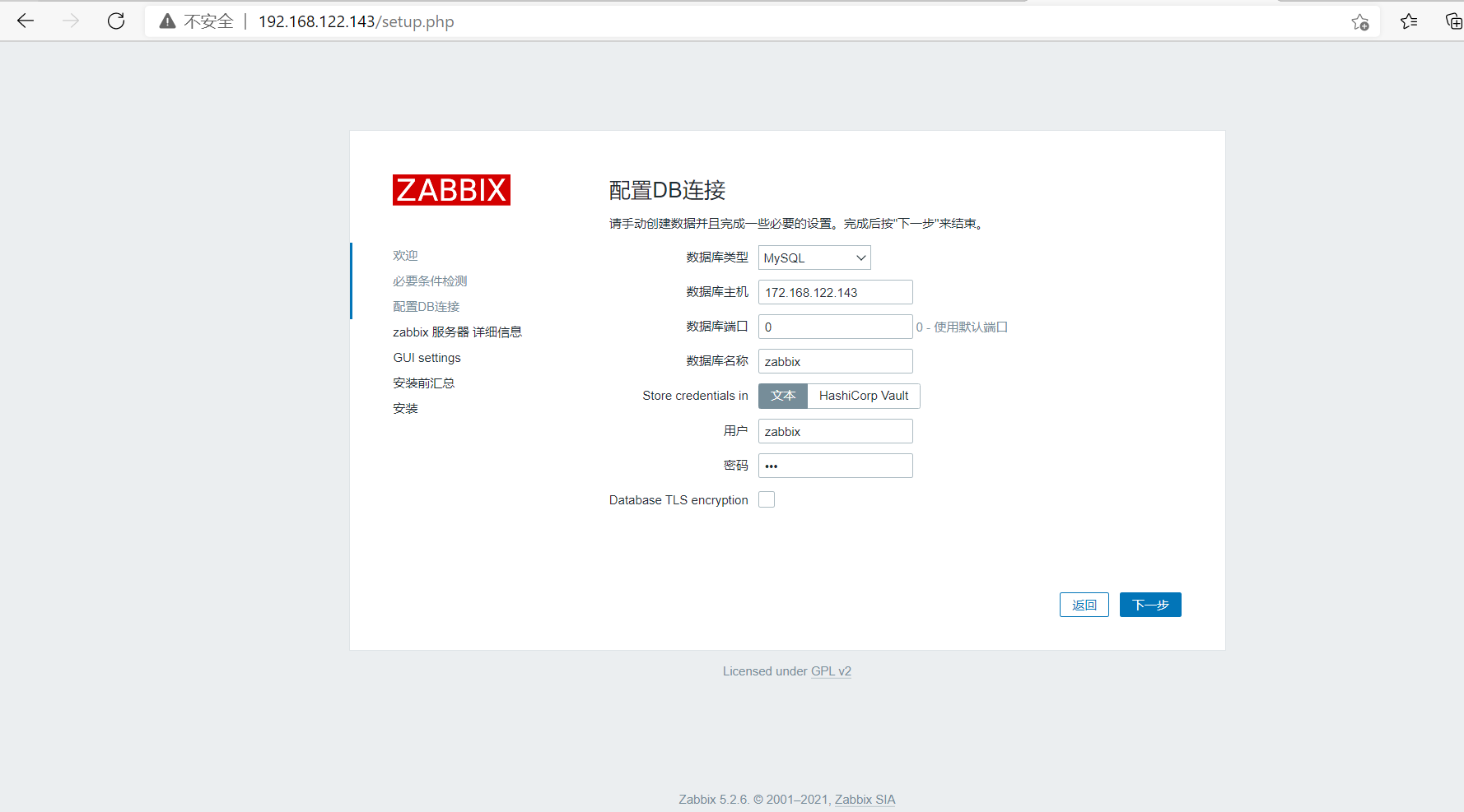 //安装依赖包 [root@cb ~]# yum -y install net-snmp-devel libevent-devel //下载zabbix [root@cb ~]# cd /usr/src/ [root@cb src]# wget https://nchc.dl.sourceforge.net/project/zabbix/ZABBIX%20Latest%20Stable/5.6.2/zabbix-5.2.6.tar.gz //解压 [root@cb src]# ls debug kernels zabbix-5.2.6.tar.gz [root@cb src]# tar xf zabbix-5.2.6.tar.gz [root@cb src]# ls debug kernels zabbix-5.2.6 zabbix-5.2.6.tar.gz //创建zabbix用户和组 [root@cb src]# useradd -r -M -s /sbin/nologin zabbix //配置zabbix数据库 [root@cb ~]# mysql -uroot -p Enter password: Welcome to the MySQL monitor. Commands end with ; or \g. Your MySQL connection id is 7 Server version: 5.7.31 MySQL Community Server (GPL) Copyright (c) 2000, 2020, Oracle and/or its affiliates. All rights reserved. Oracle is a registered trademark of Oracle Corporation and/or its affiliates. Other names may be trademarks of their respective owners. Type 'help;' or '\h' for help. Type '\c' to clear the current input statement. mysql> mysql> create database zabbix character set utf8 collate utf8_bin; Query OK, 1 row affected (0.00 sec) mysql> grant all privileges on zabbix.* to zabbix@localhost identified by '123'; Query OK, 0 rows affected, 2 warnings (0.01 sec) mysql> grant all privileges on zabbix.* to zabbix@192.168.122.143 identified by '123'; Query OK, 0 rows affected, 1 warning (0.00 sec) mysql> flush privileges; Query OK, 0 rows affected (0.00 sec) mysql> quit Bye [root@cb ~]# cd /usr/src/zabbix-5.2.6/database/mysql/ [root@cb mysql]# mysql -uzabbix -p123 zabbix < schema.sql mysql: [Warning] Using a password on the command line interface can be insecure. [root@cb mysql]# mysql -uzabbix -p123 zabbix < images.sql mysql: [Warning] Using a password on the command line interface can be insecure. [root@cb mysql]# mysql -uzabbix -p123 zabbix < data.sql mysql: [Warning] Using a password on the command line interface can be insecure. [root@cb mysql]# ls data.sql double.sql images.sql Makefile.am Makefile.in schema.sql //编译安装zabbix [root@cb zabbix-5.2.6]# ./configure --enable-server \ > --enable-agent \ > --with-mysql \ > --with-net-snmp \ > --with-libcurl \ > --with-libxml2 [root@cb zabbix-5.2.6]# make install