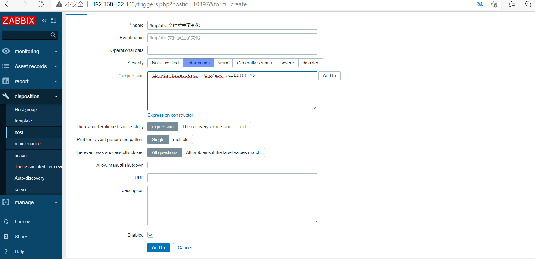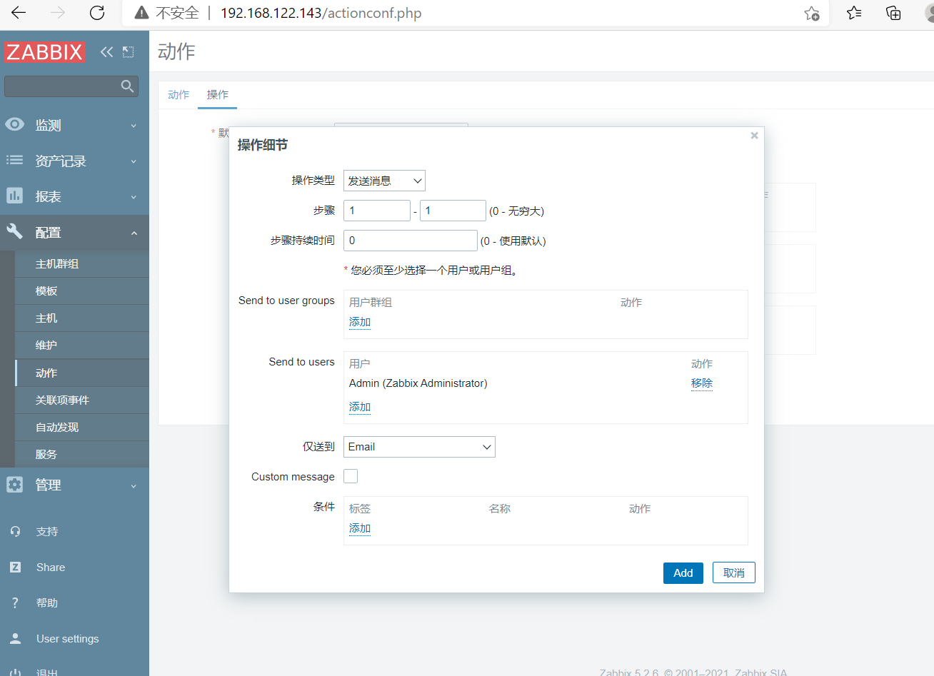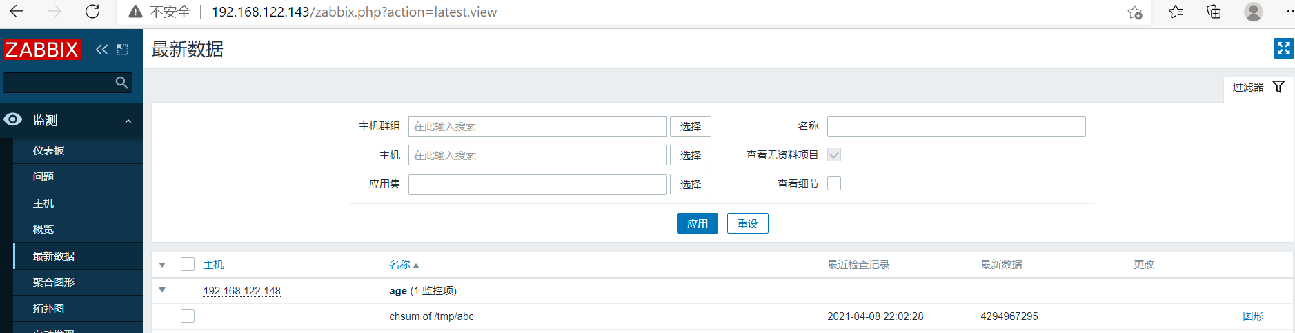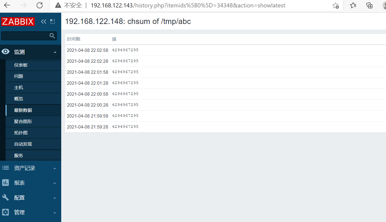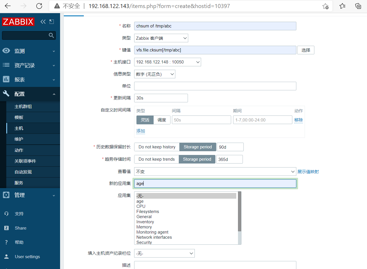 [root@cxx ~]# wget https://cdn.zabbix.com/zabbix/sources/stable/5.2/zabbix-5.2.6.tar.gz [root@cxx ~]# tar xf zabbix-5.2.6.tar.gz [root@cxx ~]# cd zabbix-5.2.6/ [root@cxx zabbix-5.2.6]# ./configure --enable-agent [root@cxx zabbix-5.2.6]# make install [root@cxx ~]# useradd -r -M -s /sbin/nologin zabbix //修改配置文件 [root@cxx etc]# vim zabbix_agentd.conf # Server= Server=192.168.122.143 # ServerActive= ServerActive=192.168.122.143 # Hostname= Hostname=cb [root@cxx etc]# zabbix_agentd [root@cxx etc]# ss -antl State Recv-Q Send-Q Local Address:Port Peer Address:Port LISTEN 0 128 0.0.0.0:22 0.0.0.0:* LISTEN 0 128 0.0.0.0:10050 0.0.0.0:* LISTEN 0 128 [::]:22 [::]:* //网页上步骤做完后触发条件 [root@cxx ~]# touch /tmp/abc [root@cxx ~]# echo "hello world" >> /tmp