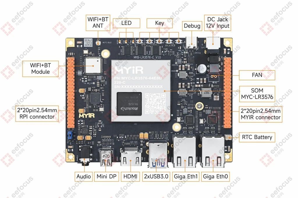 值得一提的是,笔者拿到的这个开发板型号(MYD-LR3576-64E8D-220-C)属于高配版本,带有8GB LPDDR4以及64GB eMMC,其余外设接口资源分布情况如下图所示。