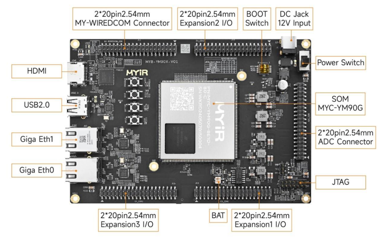 扩展底板接口非常丰富,有4个40Pin排针扩展接口,1个40Pin树莓派扩展接口。还有JTAG接口,电池接口,电源开关。