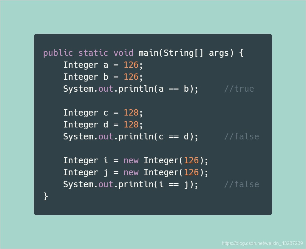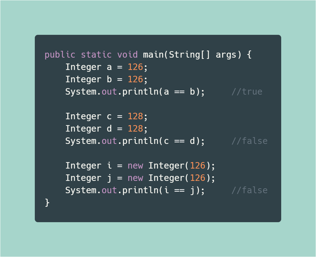 第一个和第二个的区别在于 Integer中存在缓存机制,JVM启动初期会缓存 -128~127 这个区间里面的所有数字,因此第一个位 true,第二个为false。第三个为 false 的原因在于使用了 new 关键字开辟了新空间 , i 和 j 两个对象分别指向堆中的两块内存空间。