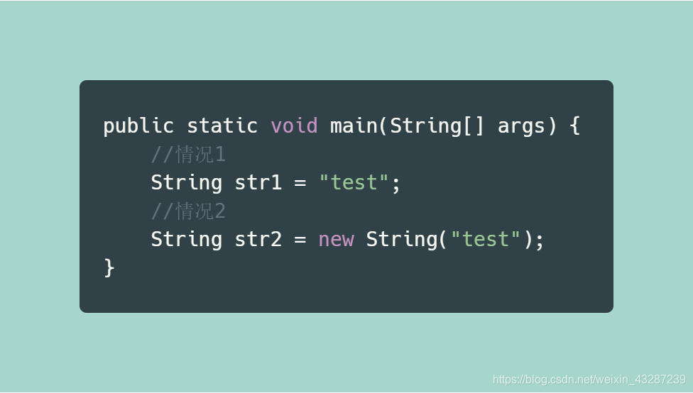 - 情况1: 最多创建一个String 对象,最少不创建String 对象,如果常量池中存在"test",那么str1会直接引用,此时不会创建对象,否则会在常量池中创建 "test" 内存空间,然后再引用。