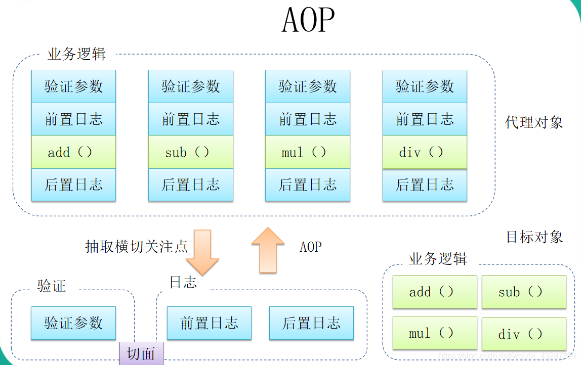AOP(Aspect-Oriented Programming, 面向切面编程): 是一种新的方法论, 是对传统 OOP(Object-Oriented Programming, 面向对象编程) 的补充。
