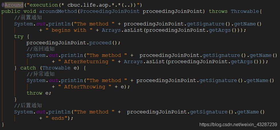 - 无论连接点是正常返回还是抛出异常, 后置通知都会执行. 如果只想在连接点返回的时候记录日志, 应使用返回通知代替后置通知.