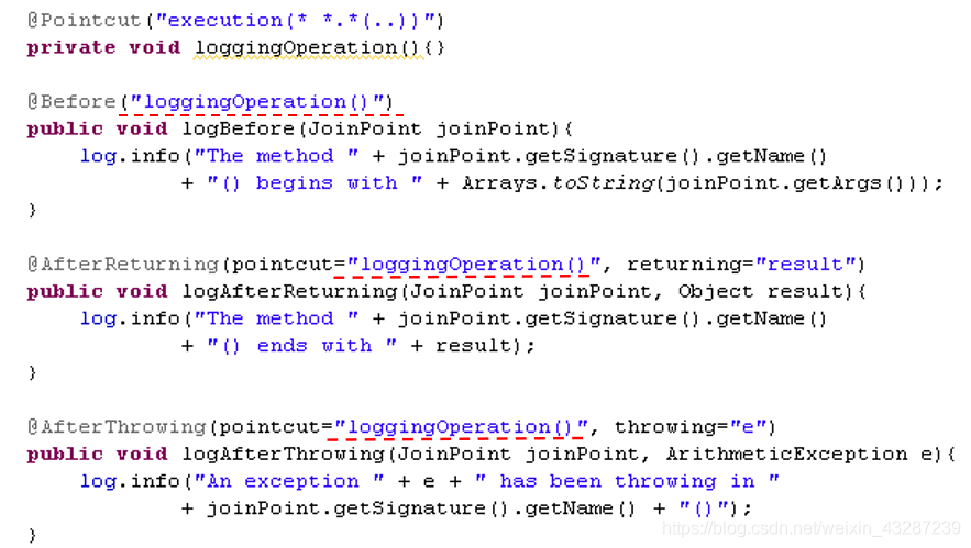 - 可以通过 @Pointcut 注解将一个切入点声明成简单的方法. 切入点的方法体通常是空的, 因为将切入点定义与应用程序逻辑混在一起是不合理的.
