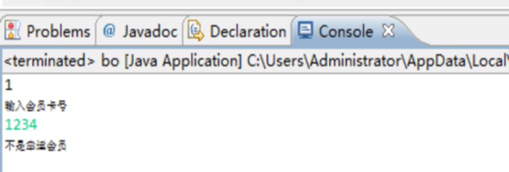 import java.util.Random; import java.util.Scanner; public class bo { /** * @param args */ public static void main(String[] args) { // TODO Auto-generated method stub Random a=new Random(); int num=a.nextInt(10); System.out.println(num); Scanner input=new Scanner(System.in); System.out.println("输入会员卡号"); int x=input.nextInt(); if(x%1000/100==num) System.out.println("幸运会员"); else System.out.println("不是幸运会员"); } }