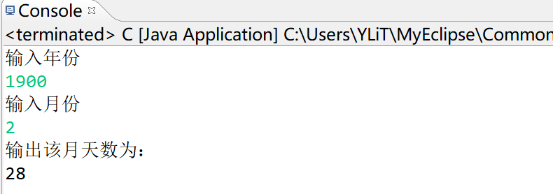 import java.util.Scanner; public class C { /** * @param args */ public static void main(String[] args) { // TODO Auto-generated method stub Scanner input=new Scanner(System.in); System.out.println("输入年份"); int year=input.nextInt(); System.out.println("输入月份"); int month=input.nextInt(); System.out.println("输出该月天数为:"); if ((year%400==0)&&year%4==0||year%100!=0&&month==2){ System.out.println("29"); } else if (month==2){ System.out.println("28"); } else if (month==1||month==3||month==5||month==7||month==8||month==10||month==12){ System.out.println("31"); }else if (month==4||month==6||month==9||month==11){ System.out.println("30"); } } }