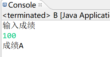 import java.util.Scanner; public class B { /** * @param args */ public static void main(String[] args) { // TODO Auto-generated method stub Scanner input=new Scanner(System.in); System.out.println("输入成绩"); int chengji=input.nextInt(); switch (chengji/10) { case 10: System.out.println("成绩"+"A"); break; case 9: System.out.println("成绩"+"A"); break; case 8: System.out.println("成绩"+"B"); break; case 7: System.out.println("成绩"+"C"); break; case 6: System.out.println("成绩"+"D"); break; default: System.out.println("成绩"+"E"); break; } } }