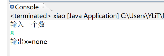 import java.util.Scanner; public class xiao { /** * @param args */ public static void main(String[] args) { // TODO Auto-generated method stub Scanner input=new Scanner(System.in); System.out.println("输入一个数"); int x=input.nextInt(); if (x==1) { System.out.println("输出x="+1); } else if(x==5) { System.out.println("输出x="+5); } else if(x==10) { System.out.println("输出x="+10); } else { System.out.println("输出x="+ "none"); } } }