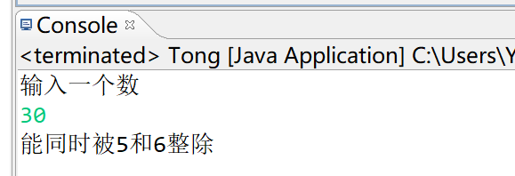 import java.util.Scanner; public class Tong { /** * @param args */ public static void main(String[] args) { // TODO Auto-generated method stub Scanner input=new Scanner(System.in); System.out.println("输入一个数"); int x=input.nextInt(); if (x%5==0&&x%6==0) System.out.println("能同时被5和6整除"); else if (x%5==0&&x%6!=0) System.out.println("只能被5整除"); else if (x%5==0&&x%6!=0) System.out.println("只能被6整除"); else if (x%5!=0||x%6!=0) System.out.println("不能被5或6整除"); } }import java.util.Scanner; public class Tong { /** * @param args */ public static void main(String[] args) { // TODO Auto-generated method stub Scanner input=new Scanner(System.in); System.out.println("输入一个数"); int x=input.nextInt(); if (x%5==0&&x%6==0) System.out.println("能同时被5和6整除"); else if (x%5==0&&x%6!=0) System.out.println("只能被5整除"); else if (x%5==0&&x%6!=0) System.out.println("只能被6整除"); else if (x%5!=0||x%6!=0) System.out.println("不能被5或6整除"); } }