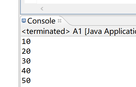 import java.util.Scanner; public class A1 { /** * @param args */ public static void main(String[] args) { // TODO Auto-generated method stub Scanner input=new Scanner(System.in); int []a={10,20,30,40,50}; for (int i = 0; i < a.length; i++) { System.out.println(a[i]); } } }