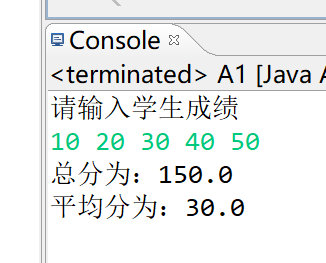 import java.util.Scanner; public class A1 { /** * @param args */ public static void main(String[] args) { // TODO Auto-generated method stub Scanner input=new Scanner(System.in); double[] score=new double[5]; double sum=0; System.out.println("请输入学生成绩"); for (int i = 0; i < score.length; i++) { score[i]=input.nextDouble(); sum+=score[i]; } System.out.println("总分为:"+sum); double pingjun=sum/5; System.out.println("平均分为:"+pingjun); } }