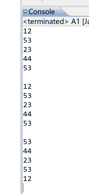 import java.util.Scanner; public class A1 { /** * @param args */ public static void main(String[] args) { // TODO Auto-generated method stub Scanner input=new Scanner(System.in); int i=0; int a[]={12,53,23,44,53}; for (i = 0; i < a.length; i++) { System.out.println(a[i]); } System.out.println(" "); for (int b:a) { System.out.println(b); } System.out.println(" "); for(int c=4;c>=0;c--) { System.out.println(a[c]); } } }