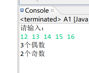 import java.util.Scanner; public class A1 { /** * @param args */ public static void main(String[] args) { // TODO Auto-generated method stub Scanner input=new Scanner(System.in); System.out.println("请输入:"); int[] a=new int[5]; int jisum=0,ousum=0; for (int j = 0; j < a.length; j++) { a[j]=input.nextInt(); if(a[j]%2==0) { jisum++; } else { ousum++; } } System.out.println(jisum+"个偶数"); System.out.println(ousum+"个奇数"); } }