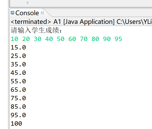 import java.util.Scanner; public class A1 { /** * @param args */ public static void main(String[] args) { // TODO Auto-generated method stub Scanner input=new Scanner(System.in); System.out.println("请输入学生成绩:"); double[] a=new double[10]; for (int j = 0; j < a.length; j++) { a[j]=input.nextDouble(); if(a[j]+5==100) { System.out.println(100); } else { System.out.println(a[j]+5); } } } }