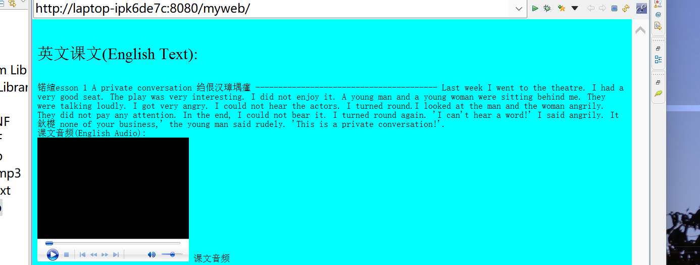 <%@ page language="java" import="java.util.*" pageEncoding="utf-8"%> <!DOCTYPE HTML PUBLIC "-//W3C//DTD HTML 4.01 Transitional//EN"> <html> <head> <title></title> </head> <body bgcolor=cyan> <br>英文课文(English Text):</br> <p style="font-family:宋体;font-size:18;color:black"> <jsp:include page="english.txt"/> <br>课文音频(English Audio):</br> <jsp:include page="audio.jsp"/> </p> </body> </html>