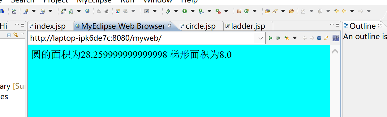 <%@ page language="java" import="java.util.*" pageEncoding="utf-8"%> <!DOCTYPE HTML PUBLIC "-//W3C//DTD HTML 4.01 Transitional//EN"> <html> <head> <title></title> </head> <body bgcolor=cyan> <jsp:include page="circle.jsp"> <jsp:param value="3" name="r"/> </jsp:include> <jsp:include page="ladder.jsp"> <jsp:param value="3" name="a"/> <jsp:param value="5" name="b"/> <jsp:param value="2" name="h"/> </jsp:include> </body> </html>